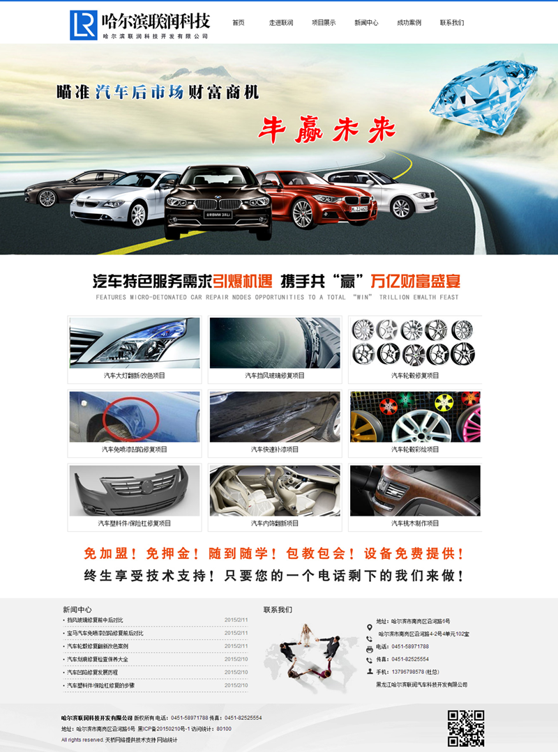 哈爾濱聯(lián)潤(rùn)科技開發(fā)有限公司,是一家以:汽車大燈翻新/改色項(xiàng)目、汽車擋風(fēng)玻璃修復(fù)項(xiàng)目、汽車輪轂修復(fù)項(xiàng)目、汽車免噴漆凹陷修復(fù)項(xiàng)目、汽車快速補(bǔ)漆項(xiàng)目、汽車輪轂彩繪項(xiàng)目、汽車塑料件/保險(xiǎn)杠修復(fù)項(xiàng)目、汽車內(nèi)飾翻新項(xiàng)目、汽車桃木制作項(xiàng)目為主的高科技汽車科研開發(fā)公司。